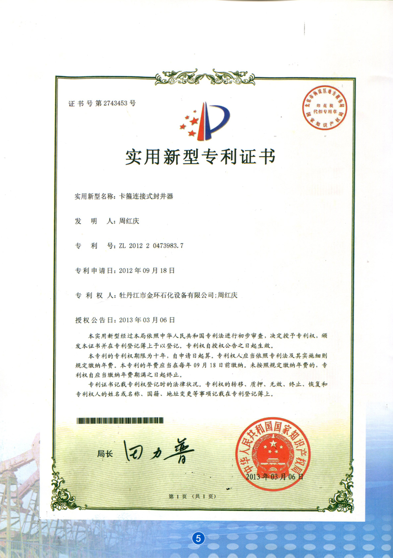 卡箍連接式封井器實(shí)用新型專利證書ZL 2012 2 0473983.7