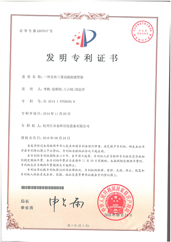 一種具有三重功能的油管錨發(fā)明專利證書ZL 2014 1 0702656.8