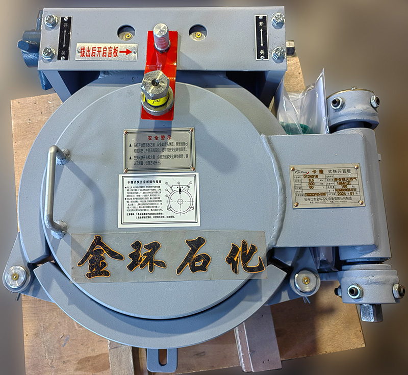 快開盲板是用于壓力管道或壓力容器的圓形開口上的一種機械裝置。一般由筒體法蘭、頭蓋、勾圈或卡箍、密封圈、安全聯(lián)鎖機構(gòu)、開閉機構(gòu)、轉(zhuǎn)臂及短節(jié)(需要時)等部件構(gòu)成。